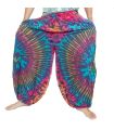Elefantenhose bunt - 100% nachhaltige Bambus Viskose (vegane Kunstseide aus natürlichen Bambusfasern synthetisiert) mit hoher, geraffter Taille. Model auf dem Foto ist 1.60m
