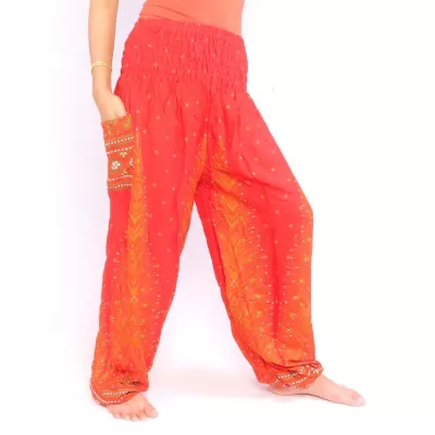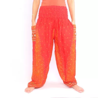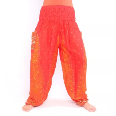 Haremshose Pfauenfeder Paisley orange - 100% nachhaltige Bambus Viskose (vegane Kunstseide aus natürlichen Bambusfasern synthetisiert) mit hoher, geraffter Taille.