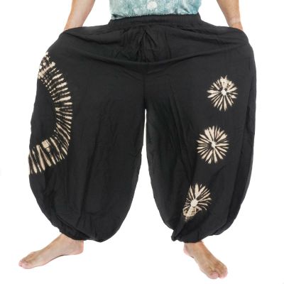 Rayon is the secret behind these harem pants: this material combines the smoothness of silk with the easy-care nature of cotton. Unlike heavy fabrics that stick to your skin in summer, rayon allows air to circulate freely. You barely feel the fabric – just a gentle embrace that flows with every movement. The batik pattern in black and off-white is created through traditional dyeing techniques, making each pair unique.