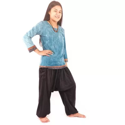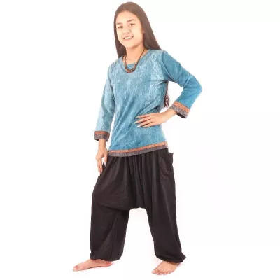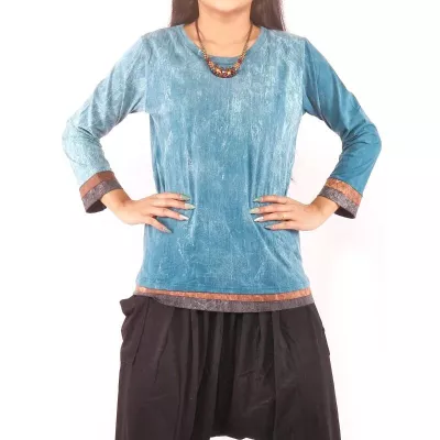 Long-sleeved shirt made of velvety cotton with colour-contrasting trim on arms and waist