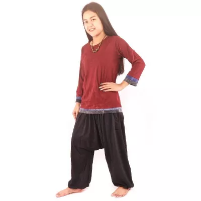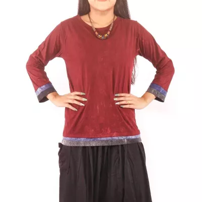 Long-sleeved shirt made of velvety cotton with colour-contrasting trim on arms and waist