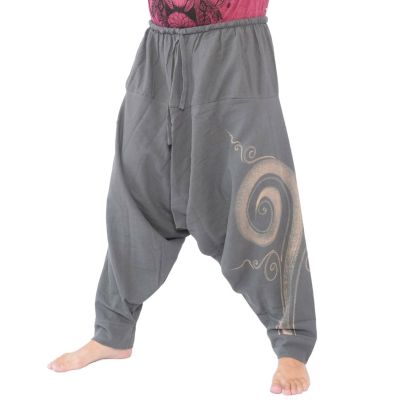 Pantalon harem bicolore vert anthracite avec spirale imprimée. Coton - Modèle (m) env. 1,80m